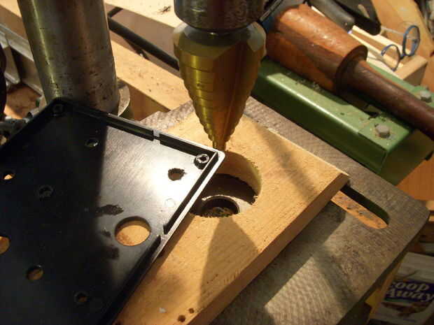 2) usando el caminado poco, he encontrado el agujero de 13/16 de pulgada. Necesitaba utilizar un trozo de madera como un soporte detrás de la tapa para evitar golpear la superficie de trabajo de mi taladro.
