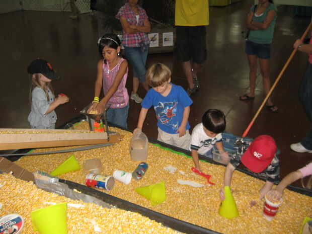 Viejos cubos, palas, tazas y juguetes de arena eran grandes para recogiendo el maíz y colocarlo en el embudo conectado a la parte superior del tubo plástico.