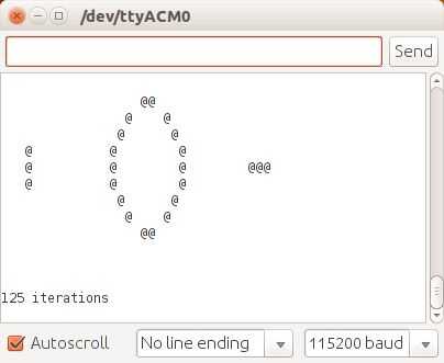 Copiar/pegar el código en el IDE de Arduino, subirlo, abra al serial monitor y establecer la velocidad en baudios a 115200. El programa mostrará el patrón inicial y esperar para la entrada. Al pulsar cualquier tecla el programa empezar a correr y continuar hasta que se corte la energía o pulse reset.