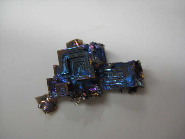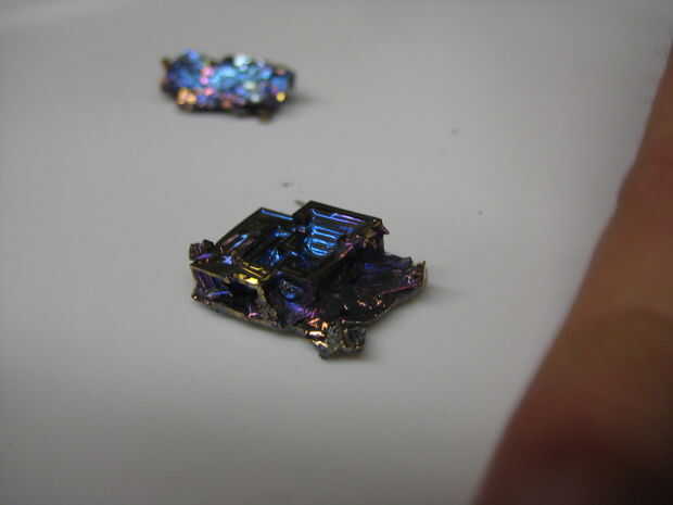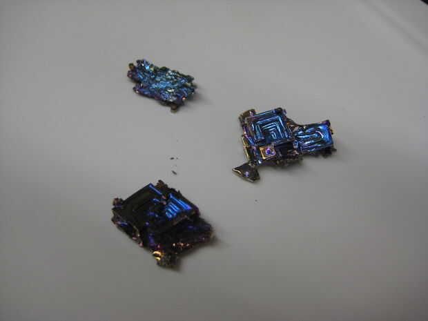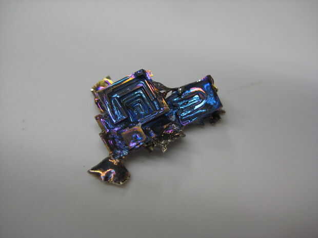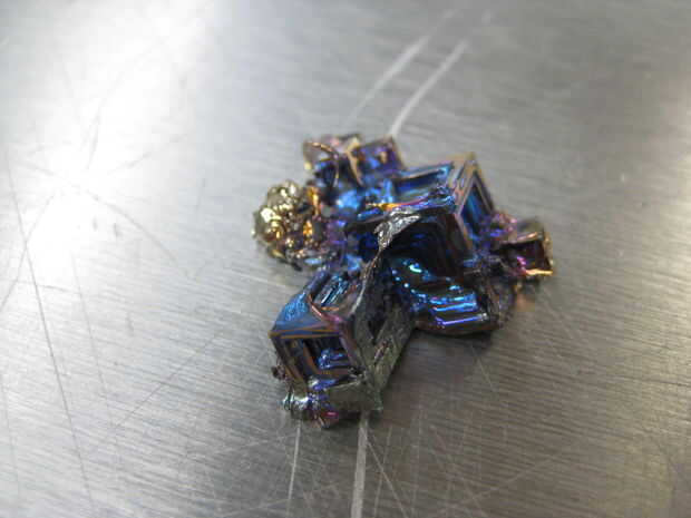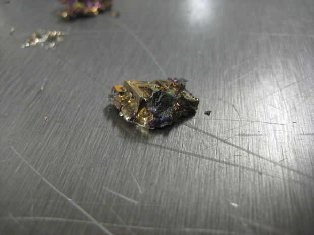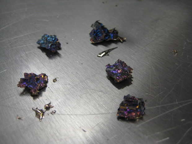 Los colores iridiscentes son causados por la oxidación, que ocurre rápidamente cuando el bismuto fundido se expone al aire. Es posible reducir esta hundiendo el cristal inmediatamente en agua, pero no pienso probar esto - la próxima vez!