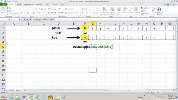 Ahora empezando en la fila 3, celular F3, ingresaremos nuestra palabra clave o frase. Esto debe ser único para cada mensaje y ser conocido por emisor y receptor. Esto puede hacerse mediante una referencia a un libro u otro material escrito o mediante el intercambio de las claves de otras maneras. La clave debe ser la misma longitud que el mensaje por lo que si es más corta que el mensaje de la frase que usted elija, usted tendrá que repetir hasta que se.