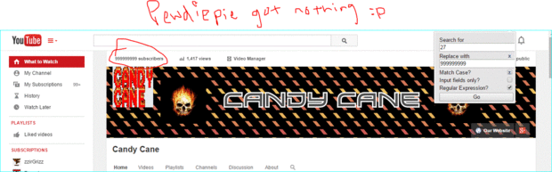 Muy bien, así como se puede ver en la imagen que pasó de 27 se suscribe a 999999. Lamentablemente una vez que refresques la página restablece porque estoy seguro de que no se pueden cambiar permanentemente las páginas web con la extensión. Si usted quiere hacer eso, entonces usted debe probablemente mirada en XSS cross scripting