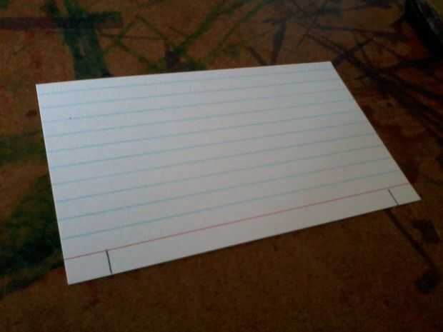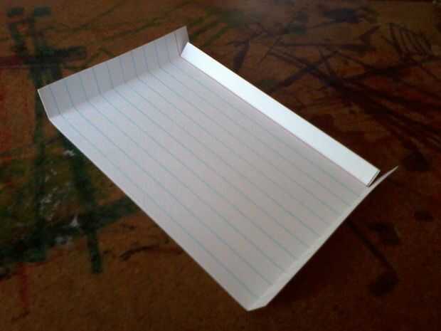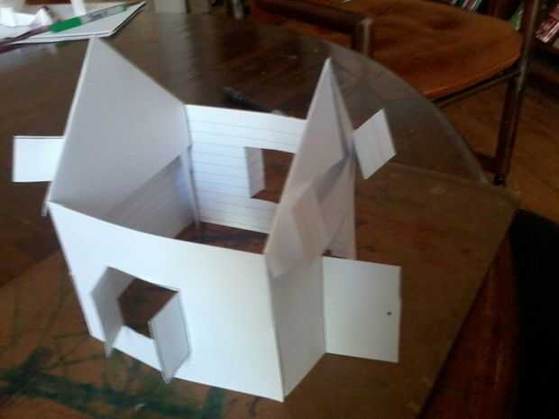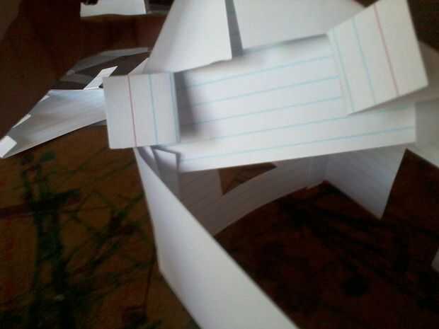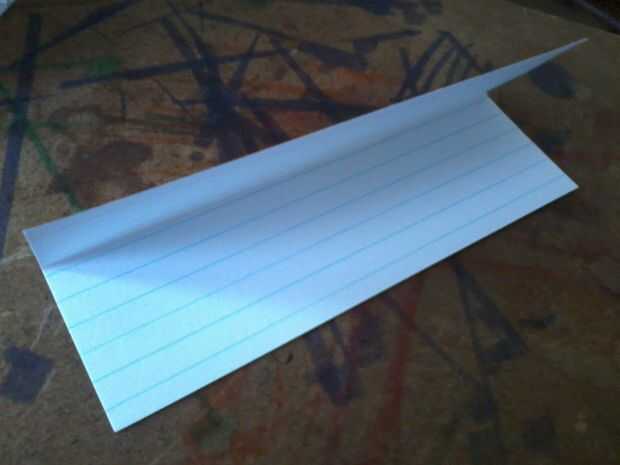 Para crear el techo, dos tarjetas de índice y corte una ranura de 1/4" en la parte inferior aproximadamente 1/2" desde cada extremo corto. Doble en cada extremo más corto en la ranura y, a continuación, dobla la aleta ancha de 1/4" en, todos hacia la parte revestida de la tarjeta.