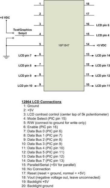 El interruptor que se muestra en el pin PIC 4 se utiliza para seleccionar el modo texto o modo gráfico en el software para nuestra configuración de prueba. Podría ser un puente en lugar de un interruptor y probablemente no sería incluida cualquier aplicación real a menos que se desea utilizar un método similar para elegir entre pantallas de gráficos diferentes. La memoria del programa en esta versión de PIC es 8k, por lo que puede llevar hasta siete gráficos completadas las definiciones de pantalla. La sección de software incluye el código fuente para ambos la versión de paralelo de 8 bits del hardware que se muestra a continuación y también el código fuente modificado para trabajar con la interfaz de registro de cambio que detallado en el episodio 1. En la versión de registro de cambio el PORTB del PIC las conexiones desaparecen y PORTA salida 0 (pin 17 del PIC) se agrega para los datos enviados para el registro de desplazamiento.