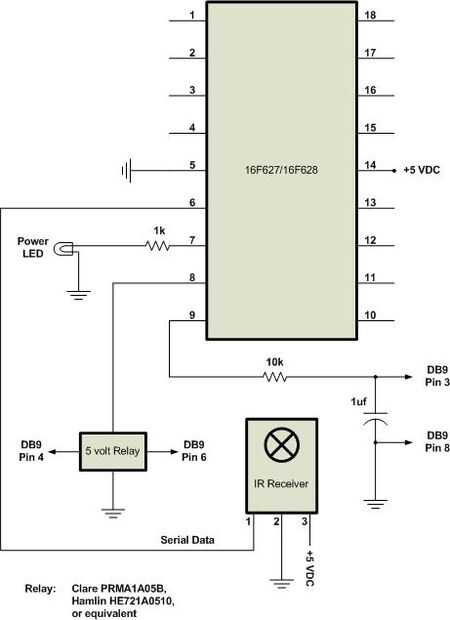 El diseño que se muestra aquí combina la capacidad PWM que se detalla en el episodio 9 con el control IR detallado en los episodios 2 y 10. Sólo necesitamos dos otras líneas de la entrada-salida por lo que parecía el 12F683 8 pines que hemos utilizado previamente sería perfecto. Por desgracia, el circuito de IR requiere el uso del pin de interrupción externa que pasa a ser el mismo pin para la salida PWM. Es por ello que el diagrama muestra el 16F627A/16F628A en lugar de otro. La única diferencia entre el 627A y el 628A es que el 627A tiene menos memoria así que cualquiera de los dos funcionará.