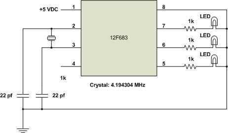 Hasta ahora, todos los proyectos PIC que he presentado han utilizado el oscilador interno. El fundamento es que nada de lo que hemos hecho hasta ahora ha sido crítico. Por lo tanto, cuando se trata de tomar la decisión de añadir piezas adicionales para un oscilador externo, determinar si es necesario un reloj más rápido de lo que está disponible internamente o si necesito algo que proporcionará una precisa del reloj en tiempo real. En el diagrama anterior, el cristal elegido parece ser una frecuencia de raro pero si se divide abajo usted encuentra que es un múltiplo binario de 1 Hz. Recibí un paquete de 10 para nada de un surtidor de China de eBay. Los condensadores de 22pf requiere también son muy baratos. En el circuito simple anterior, utilizamos el Timer1 de 16 bits del PIC para generar una frecuencia de 2 Hz. Cómo hacer y lo que hacemos con él se detallan en la sección de software.