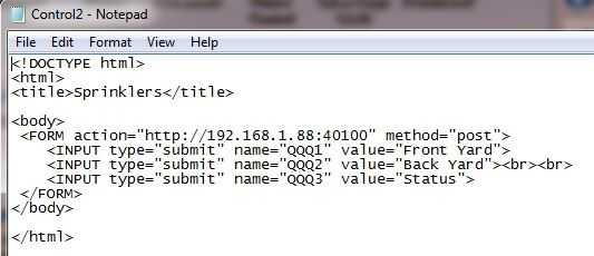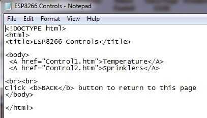 OK, así que echemos un vistazo a los archivos. La primera, que se muestra en la pantalla anterior, es ESP8266 Controls.htm. El DOCTYPE y las directivas HTML de apertura y cierre son cosas estándar para cada página web. La línea de título nos permite mostrar cualquier texto que desee en la pestaña en la parte superior de la Página Web. Las directivas del cuerpo de apertura y cierre están destinadas a contener las líneas de código pero que no parece ser un requisito duro y rápido. Simplemente llame una buena práctica de programación. Los comandos HREF añadir enlaces enlaces a la página web (con los nombres de "Temperatura" y "Sprinklers") y la ruta para el enlace especificado. Si lees el manual HTML el enlace puede ser un archivo HTML (como tenemos aquí), una dirección web (como