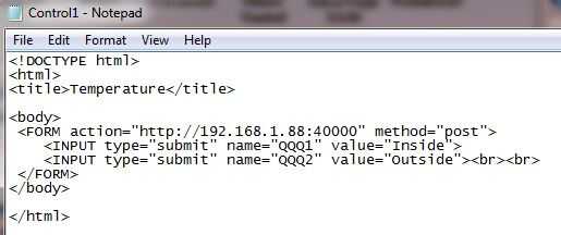 Los archivos de texto de la versión parcial de programa para la generación de HTML se incluyen a continuación. Hay tres archivos, dos de ellos (Control1 y red2) siendo las páginas que se pueden conseguir seleccionar desde archivo ESP8266 controles. Lo configuro de esta forma para que sea fácil de agregar más nodos de ESP8266 a la red. Sólo copiar uno de los archivos de Control, modificar para la nueva aplicación y asegúrese de que cambia el número de puerto en el código. Luego añadir una nueva línea de código en el archivo de controles de ESP8266 para que apunte al nuevo archivo Controlx. Es realmente sencillo.