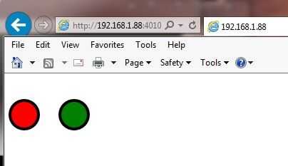 Uno de los listados a continuación utiliza el mismo comando mensaje las cuerdas y que se usaron en el episodio 19 por lo que actúa exactamente igual. El otro listado utiliza una directiva HTML más elaborada para proporcionar una indicación de lo que puede hacerse con cuerdas más largas y el espacio de memoria adicional proporcionado por el 16F1847. En este ejemplo se usan comandos HTML para dibujar dos círculos que representan el estado de la parte delantera y detrás los aspersores. Rojo = off y verde = en (una pantalla de tiro se muestra arriba). Por lo que he leído en línea usted puede ser capaz de enviar hasta 2048 caracteres con un comando CIPSEND. El ejemplo de software actualmente está limitado a 255 caracteres porque una sola ubicación de RAM de 8 bits se utiliza para la cuenta del recuento de caracteres.