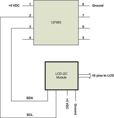 Las conexiones a lo PIC son bastante simples con sólo dos pines de I/O se utiliza. Deja otros cuatro pernos en nuestro pequeño 12F683 para obtener datos de los sensores. Obviamente, esta misma conexión puede utilizarse con el 16F688, si queremos aún más pines de I/O. Como se indicó anteriormente, el módulo tiene ya la tire requiere resistencias de las líneas SDA y SCL y un potenciómetro de control de contraste para la pantalla LCD. Generalmente estos módulos cuentan con una cabecera de 16 pines que coincide exactamente con las 16 líneas en la pantalla LCD. De hecho, usted puede comprar a un combo que incluye el tablero de I2C ya soldado a la pantalla LCD.