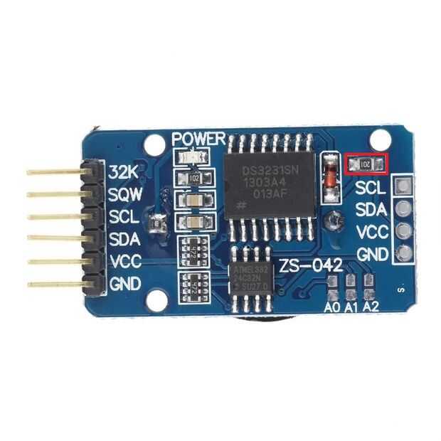 En la imagen de la junta puede ver un rectángulo rojo que describe una resistencia de montaje superficial. La razón por la que se señala es que el módulo está diseñado con un circuito simple de carga de la batería que se supone que es un tipo de 3,3 voltios de litio-ion. La Junta que recibió tuvo en cambio una batería no recargable de litio (CR2032). En este caso, la batería tampoco tiene que ser reemplazado con el tipo recargable o el resistor en el tablero debe ser extirpado. La manera fácil de sacarlo es cortar la resistencia por la mitad con un cortador de alambre y luego desoldar cada mitad de la tabla. He incluido copias de documentos PDF aquí que tienen las especificaciones para la RTC y la EEPROM. El tercer archivo PDF contiene el esquema del módulo.