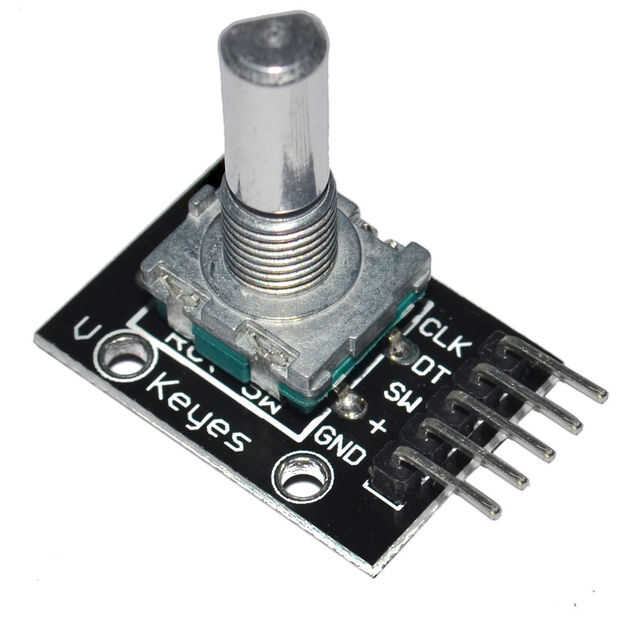Tienes un par de opciones al escoger un codificador rotatorio. Usted puede comprar la unidad codificador por sí mismo o, como se muestra en las fotos, se puede comprar montado en un tablero. Usted también encontrará que algunos encoders vienen con un interruptor incorporado y diferentes codificadores tienen un diverso número de cliks en plena revolución. Para este proyecto me compré un módulo de encoder como se muestra en las fotos. El módulo incluye 10 k Levante la resistencias de las líneas DT y CLK y tiene un lugar (R1) para otra resistencia k 10 para la salida del interruptor. Ese punto de resistencia está abierto cuando el módulo. Se activa el interruptor sí mismo empujando hacia abajo sobre el eje del encoder y proporciona un contacto momentáneo a la tierra.