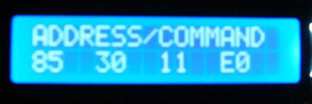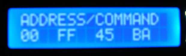 Aquí hay un par de fotos (malas) que muestran resultados típicos. El primero de ellos muestra el resultado de un control remoto barato que se adhiere a la NEC original estándar de dirección, dirección inversa, mando y comando inverso. La segunda foto es de un Tivo remoto y muestra la dirección ampliada, así como dos bytes de comandos diferentes.