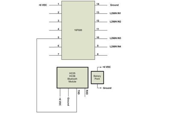 Las conexiones a lo PIC son un poco diferentes que en el episodio anterior sobre Bluetooth. En primer lugar, no necesitamos conectar a la entrada RXD del Bluetooth para que la conexión se ha ido. En segundo lugar, necesitamos cuatro salidas de puerto de I/O para el control de los motores impulsores. Estas líneas conectan a los terminales de "Entrada" en el tablero de L298N para controlar al avance y reversa para cada motor. El paquete de baterías que utiliza consiste en 4 baterías del AA y pone hacia fuera un nominal + 6VDC. Todos los circuitos que se utilizan aquí (incluyendo el L298N) están dentro de especificaciones en este voltaje por lo que no hay necesidad de reducirla a + 5 voltios.