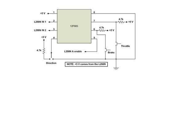 La primera imagen muestra las conexiones del PIC. Los valores de resistencia no son críticos ya que sólo se utilizan para sostener sus respectivos pines de entrada en un nivel lógico alto. Hay resistencias pull-up débil internamente en el PIC que podría utilizarse en su lugar pero prefiero utilizar resistores externos para una mayor inmunidad de ruido. El interruptor de dirección es un simple interruptor SPDT (un polo doble tiro) sin un centro de la posición de apagado. Los interruptores del acelerador y el freno se muestran como normalmente abiertos, momentáneos contacto botones. Fácilmente podría reemplazar estos dos interruptores con un sola SPDT toggle interruptor de contacto momentáneo. En este caso, el contacto de centro se conectaría a tierra, uno fuera de contacto conectado al pin de mariposa del PIC y el otro contacto externo conectado al pin de freno del PIC. De esa manera podría empujar el interruptor hacia arriba para acelerar y hacia abajo para frenar. Soltando el interruptor volvería al centro de la posición de apagado en sus el propios.