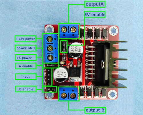 La segunda foto es nuestro viejo amigo el módulo de puente H dual L298N que hemos utilizado en un episodio anterior. Las diferencias de cableado en esta aplicación se basan en dos cambios desde nuestra aplicación anterior. En primer lugar, necesitamos + 5 VCC para la lógica del módulo y para el PIC pero queremos + 12 VDC para conducir el motor. En este caso aplicaremos los + 12 VCC a la "+ 12V power" entrada el L298N y dejaremos el puente "enable 5V" en su lugar. Esto permitirá que el módulo construido en regulador de 5 voltios en función de la entrada de 12 voltios. Luego se toma la conexión "+ 5" en el módulo y utilice para alimentar nuestro circuito PIC. No olvide conectar los cables de tierra para el + 12 de entrada y el + 5 salida al módulo "alimentación GND".