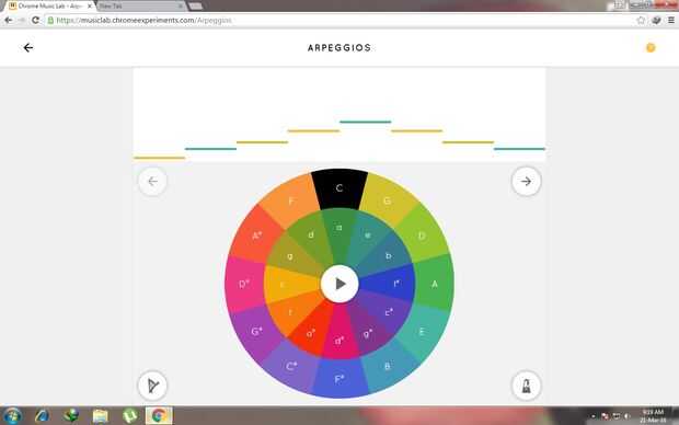 Un arpegio es un acorde tocado una nota en un momento. Este experimento te permite jugar arpegios en diferentes patrones. Pulse la rueda para explorar acordes mayores y menores.
