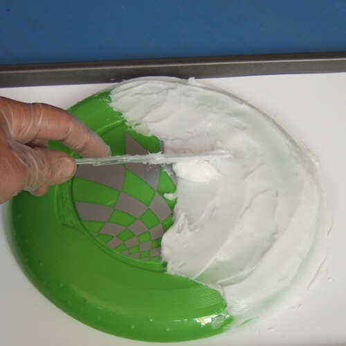 Mezclar un lote con la cuchara de plástico y luego usarlo para cubrir el Frisbee con un espesor de alrededor de 3/16" a 1/4". Como el Oogoo desprende vapores de ácido acético, es una buena idea hacerlo fuera o cerca de un ventilador. Se recomiendan guantes de vinilo o de nitrilo.