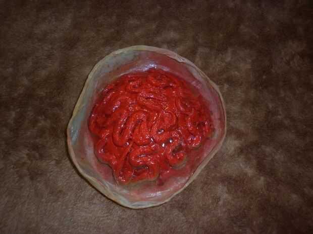 4. hacer el cerebro con una bola, látex de caucho, cuarto de baño armado, pintura y sangre. Intente utilizar un globo pero terminan para arriba como un corazón.