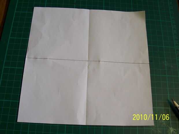 Doble lado llano borde a borde y pliegue bien. Abrir y repetir para las otras dos aristas, pliegue bien. Abrir y ver las líneas cruzadas a través del medio.