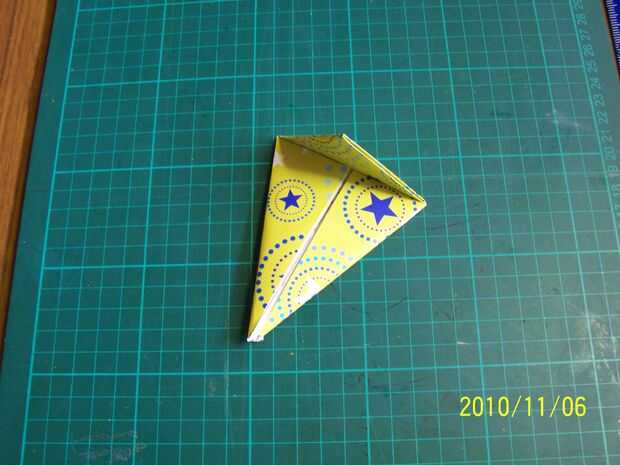 En la parte superior de la cometa forma es un triángulo pequeño. Doblar hacia adelante a través para hacer un pliegue que marca la línea para referencia futura. Esto no se utiliza en este momento.