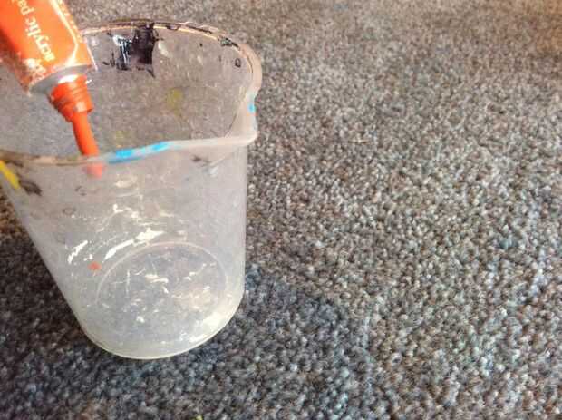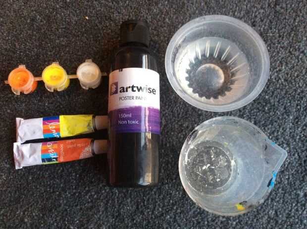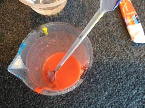 Grabbing your acrylic paints, squirt a little into a painting cup or container and add a little water to it. Do the same with all the paints until you have a watery paste.