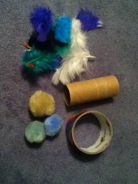 Se necesita un tubo vacío de TP, plumas color arte, cinta pato o pompones o relleno de algodón.