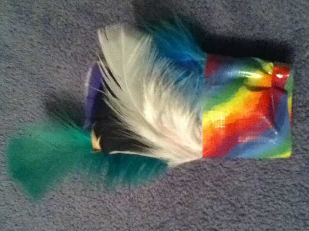 Rodillo hacia fuera 6-12inches de cinta pato. Plumas de palo a la cinta de pato con 1" en la cinta la parte puntiaguda poco fuerte deben estar en la cinta pato. Envuelva la cinta con plumas de pato en la parte inferior del tubo TP. Las plumas que cubren el tubo TP por lo menos la mayoría de la manera.