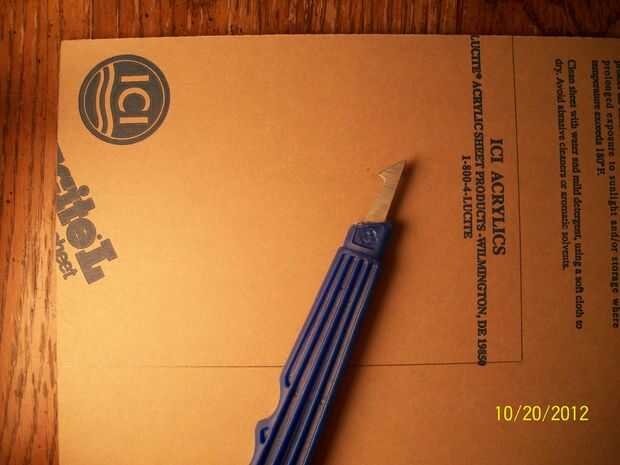 El cuchillo de corte de acrílico es muy fuerte. Ten mucho cuidado. Guantes y un espacio de trabajo bien iluminada es importante. Coloque un pedazo de madera de desecho bajo el acrílico mientras que usted está cortando. Utilice un borde recto metálico para hacer los cortes y arrastrar el cuchillo claro de la hoja. Toma unos cuantos pasaron antes de que el acrílico es listo se desprendió. El 1 / 4 hoja tomó cerca de 60 pases.