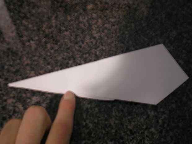 este aeroplano de papel es mi interperation de la superficie de sustentación de Kline/Fogleman. ? ¿Qué es eso? pregunte. Es un diseño de superficie de sustentación que incorpora un "paso" en el ala, que parece hacer un avión volar más suaves y c