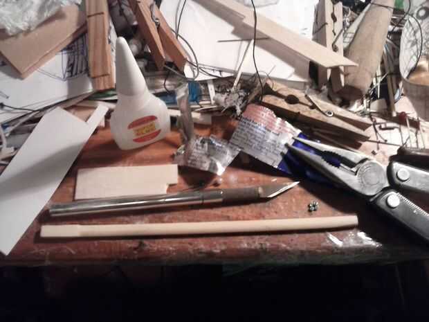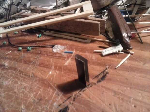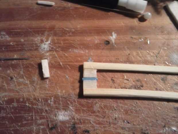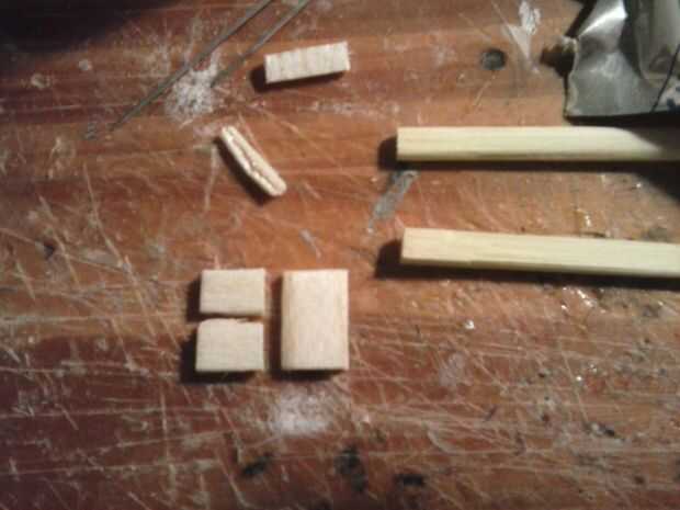 Cortar un rectángulo (mina de medida 10 x 6 x 1,6 mm) de una pieza de madera para el extremo inferior de la estructura del helicóptero. Luego cortar 2 rectángulos más pequeños de la misma pieza delgada de madera (ninguno de los dos en la mía mide 4 x 6 x 1,6 mm) para el extremo superior del marco.
