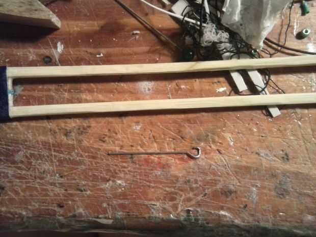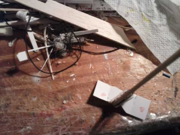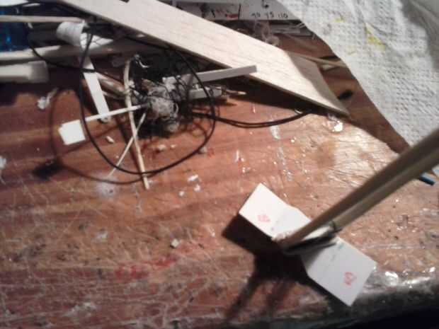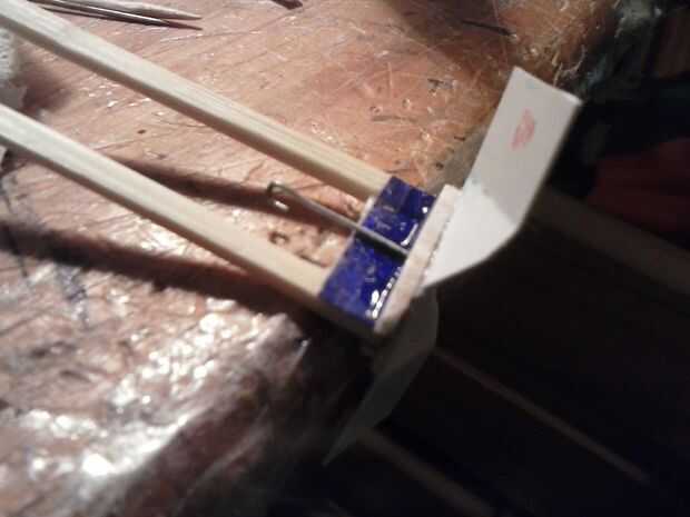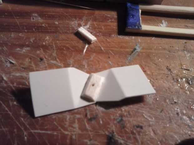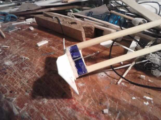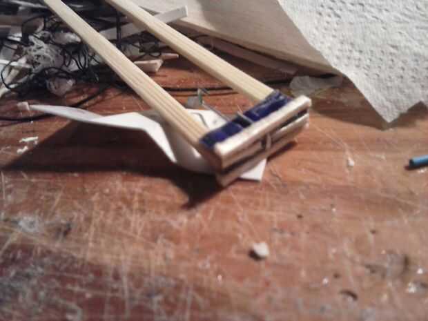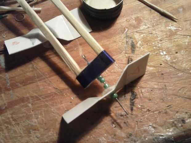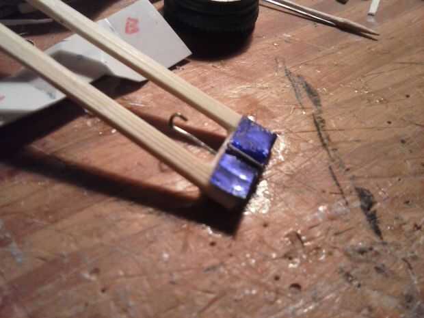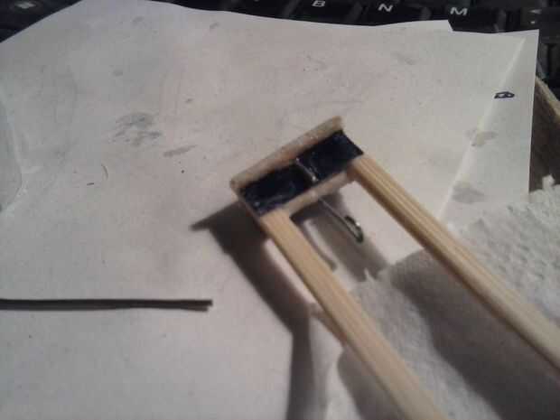 A continuación, agregue el cubo de fondo para el conjunto de la parte inferior de las palas del rotor. Porque hay un pin en la parte inferior del marco, probablemente no será lo suficientemente plana para pegar el centro a. Solucionar este problema cortando algunos thinstrips de madera y pegar en la parte inferior del marco [ver cuadros 14 y 15]. El centro de la parte inferior a estas piezas de madera del pegamento y asegúrese de que no esté sesgado.