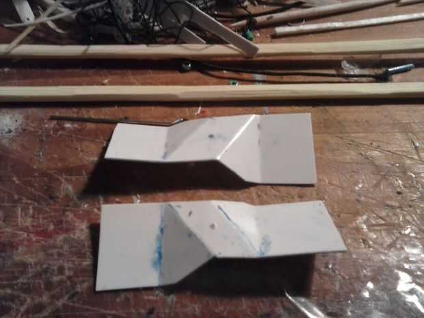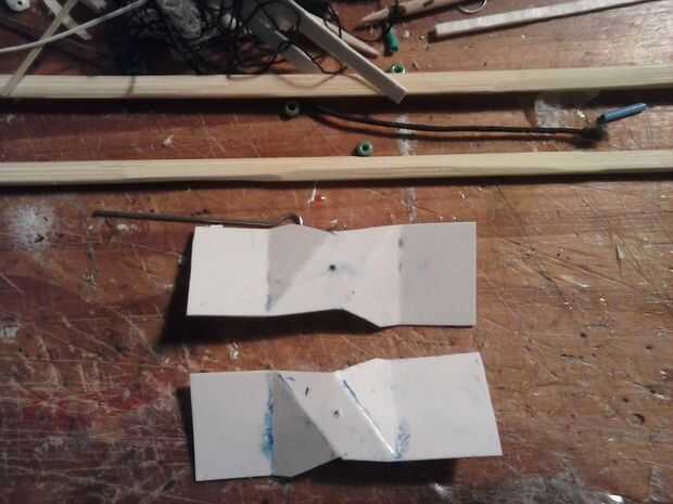 Las líneas rojas en [Foto 2] son los ejes para doblar el cubo del aspa accesorio. El interior dos deben tener todo lo inclinó hacia afuera de ellos. Las dos líneas externas deben tener todo doblado hacia afuera de ellos hacia arriba. Una vez que ha hecho un cubo, seguir el mismo proceso para hacer el segundo, pero recuerde que debe ser el reflejo de la primera porque se estar girando al revés. [Véase el cuadro 6]