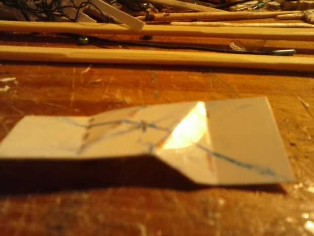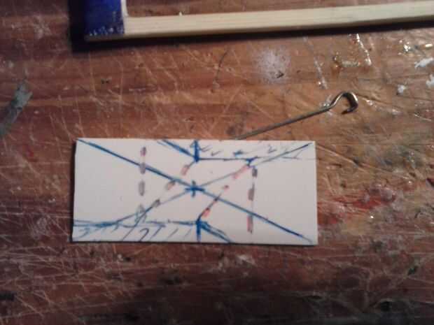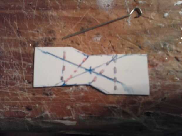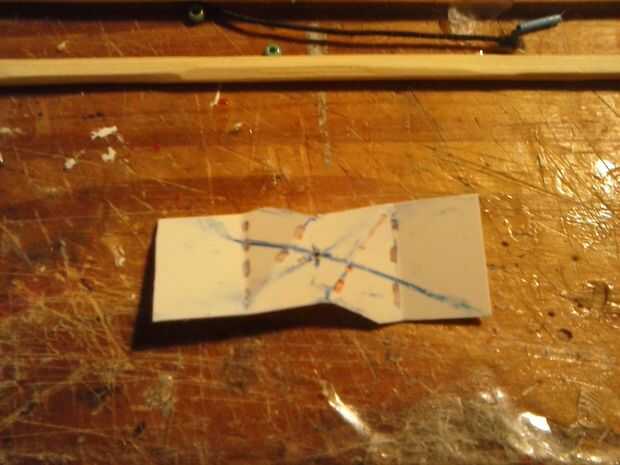 A continuación, usted necesitará hacer los cubos de rotor de imagen especular 2. Para esto, utilizará ese plástico de un contenedor. Cortar 2 rectángulos de él (mina eran ambos 15 x 4 mm) y determinar el punto quitaban de ambos mediante la elaboración de 2 líneas de esquina a esquina y su intersección es el punto que necesita. Un agujero a través de este punto del pinchazo. [Véase el cuadro 2 ver cómo llegué a este punto y aproximadamente donde serán otras líneas] Lo mejor que puedo decirles acerca de cómo encontrar donde estarán las nuevas líneas es mirar fotos 2-6 y copiar. (En este modelo corté 2 tiras de cada uno pero que no es necesario).