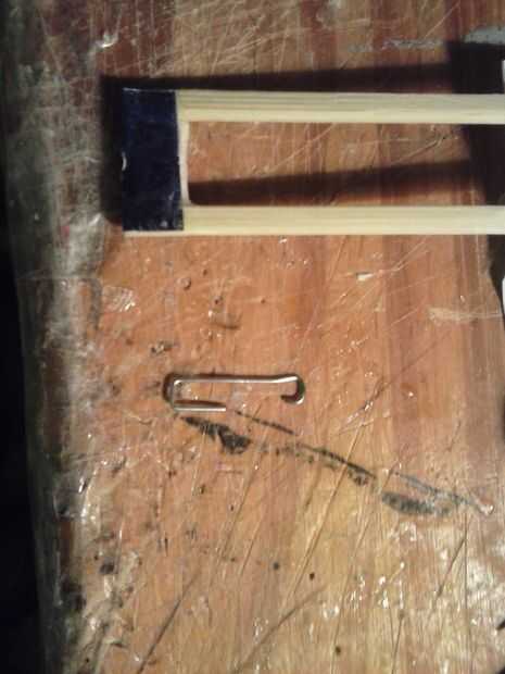A continuación, hacer el gancho elástico. La cabeza el otro pin del clip y doblar en forma de "G" [foto 12]. Poner esto en la parte inferior de la estructura del helicóptero y asegúrese de que está en el centro del separador inferior antes de pegarlas en su lugar. [Véase el cuadro 13]