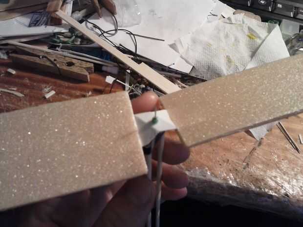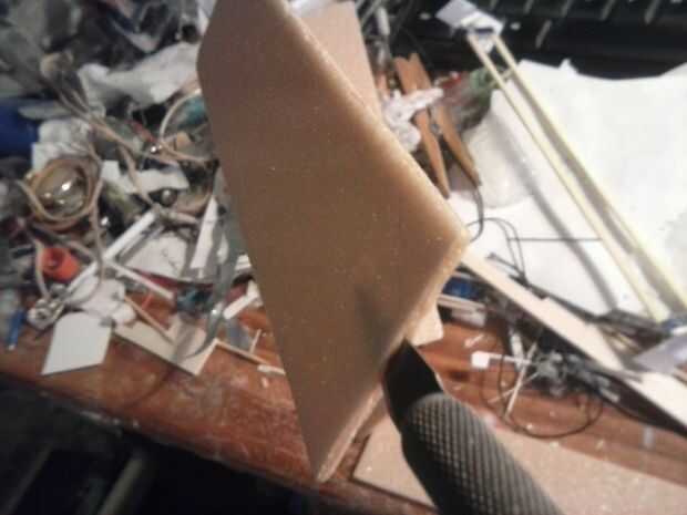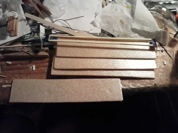 Comience con una hoja de espuma de poliestireno del embalaje o similar y cortar 4 rectángulos iguales fuera de él. (Cada uno de mis hojas mide 160 mm x 35 x 2 mm)