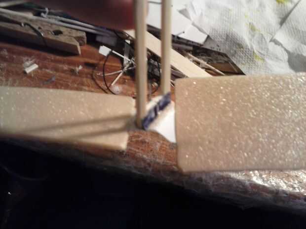 (Para la central eléctrica de banda elástica encuentro que cadenas de unos elásticos estrechos funcionan mejor que uno o dos unos grandes. También, para mejor duración del vuelo que el elástico debe ser más largo que el marco para que el extremo inferior puede ser sostenido con la mano mientras se enrolla el extremo superior, causando el elástico para "acortarla" entonces se puede enganchar en el gancho de la parte inferior del marco.)