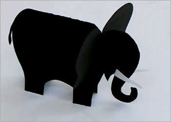 Tomar una tira de papel negro para hacer las orejas enormes, y realizar los ojos y colmillos de elefante con papel blanco.