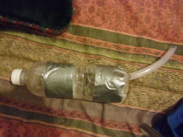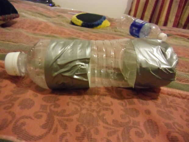 Primero remodelar la botella en más de un rectángulo luego (ver Fig. 1) Envuelva cinta adhesiva alrededor de él para que se lleve a cabo su forma. Ahora corte 2 5'' pedazos de tubo (sin necesidad de medir, es áspero, podría ir tan poco como 3''). A continuación cortar un agujero en el extremo de la botella de agua que no tiene la tapa que es un poco más grande que el tubo. Inserte el tubo y pegamento en caliente. Ahora cuando la tapa está encendido, es la única manera de aire debe ser capaz de escapar a través del tubo.