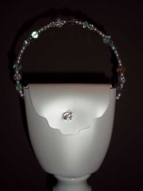 Hice un bolso de boda para una ducha nupcial. La botella que usé tenía un brillo perla blanco a él y el mango era cristales austriacos. Llenó de una tarjeta de regalo de spa y un chocolate de Godiva.