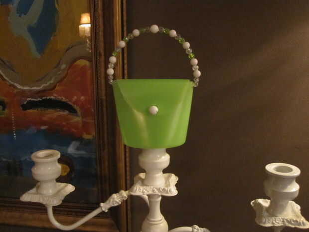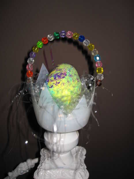 Para la cesta de los huevos de Pascua, usé una botella redonda. Corte la botella para parecerse a un huevo roto y colgados alrededor de la casa llenada de huevos decoradas y dulces.
