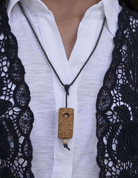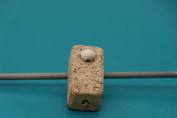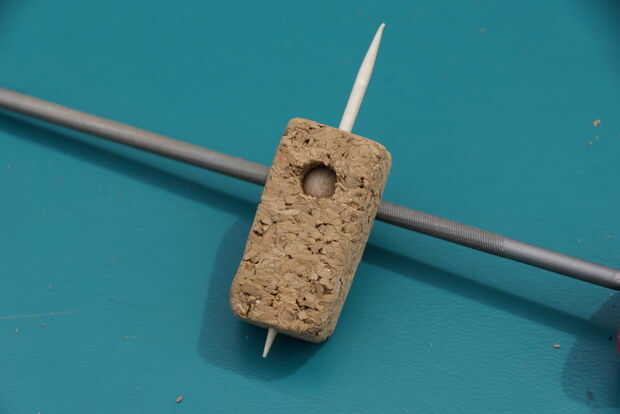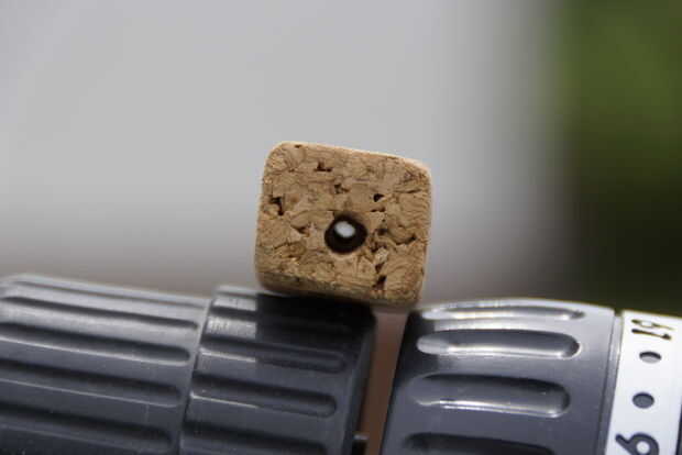 Cuidando que el grano de madera tiene sus orificios hacia arriba y hacia abajo, coloque en el corcho y cuando está cerca del centro, utilice un palillo de dientes para alinear sus agujeros con el orificio principal (hihi... deben estar riendo ahora con la forma como he intentado explicar lo de todo agujero. Tal vez es mejor para usted mismo con las fotos.)