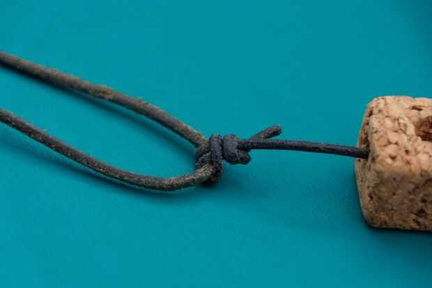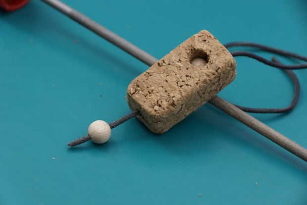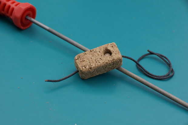 Una vez que los agujeros estén alineados, es hora de Deslice un trozo pequeño de cable a través de la construcción. Para hacerlo más interesante, tomé otro grano y había atado con un nudo en el extremo de la cuerda.