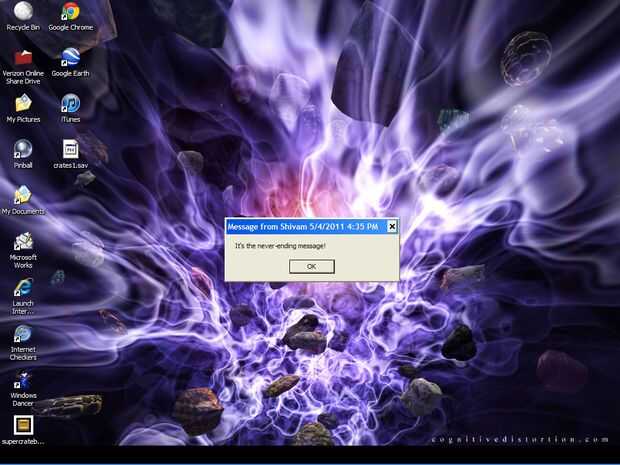 Aquí es un divertido, divertidony, y manera fácil de molestar a tus amigos y familiares por jugar con sus equipos (inofensivo). Este es un simple archivo por lotes que hace un cuadro de mensaje emergente que dice lo que quieras. El truco: no importa cuántas veces usted haga clic en aceptar, el mensaje nunca desaparece! ¡Que te diviertas!