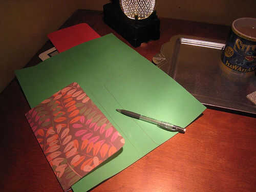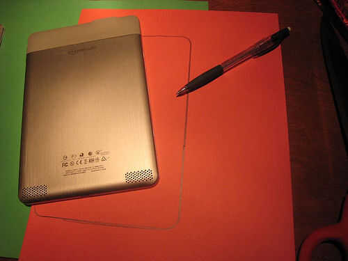 ¿Tienes todo juntos? Gran. Para comenzar, coloque el Kindle a lo largo del borde doblado de la carpeta. Trace una línea alrededor de tu Kindle con el lápiz en ambas carpetas. En el rastro de la carpeta de papel amplia y en la carpeta de poli mantener la línea más cercana al borde real de la Kindle.