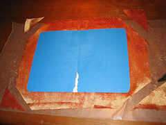 Ahora toma la tela y dale la vuelta. No deje que la imagen a confundirte, es azul dentro de la carpeta color coral que había estado utilizando. Ahora vamos a recortar a la tela un poco. Biselado de las esquinas como se muestra a hacer plegable más fácil y menos voluminoso. Ahora es el momento para el pegamento más, esta vez cubierta de espesor sobre el tejido expuesto y la carpeta interna, a fin de estar seguro espera juntos agradable y seguro. Otra vez, ir tomar té mientras dejas que este seco.