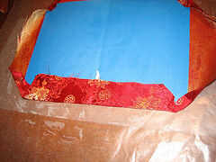 a partir de las esquinas, plegar la tela suavemente el interior borde, tirando de la tela hacia adentro como usted aprieta. Recorte algunas superposiciones de tela pero no recortar demasiado cerca de la orilla. ¡ Estamos en la recta final! Esa carpeta la capa sobre la tela con una capa fresca de cola, asegúrese de trabajar algunos bajo cualquier pliegues en las esquinas y leer un capítulo en su Kindle mientras se seca todo.