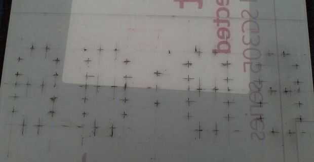 Lo primero que queremos hacer es crear nuestro tablero de LED. Esencialmente estamos creando una gran pantalla de 7 segmentos con 2 LEDs por segmento versus comprar un display de 7 segmentos real este tamaño que sería muy caro. La pantalla es simétrica por lo que se quiere averiguar la distancia que desee entre un lado de cada dígito y el otro y luego utiliza ese valor para el espaciado de los 3 segmentos horizontales así. Puede ayudar a dibujar cajas para los segmentos de los dígitos y luego marque las ubicaciones de LED a cada lado de sus plazas como 1/3 de la longitud del cuadrado en cada borde. Ver las fotos. Uno de los grande descuentos en este proyecto es poner los LEDs están lo suficientemente juntos que puede torcer los cables para crear una conexión común. No haga que la pantalla tan grande que esto no funciona. Si utilizas una gran pantalla, puede aumentar el número de LEDs así. He usado cerca de 1.5" espaciado.