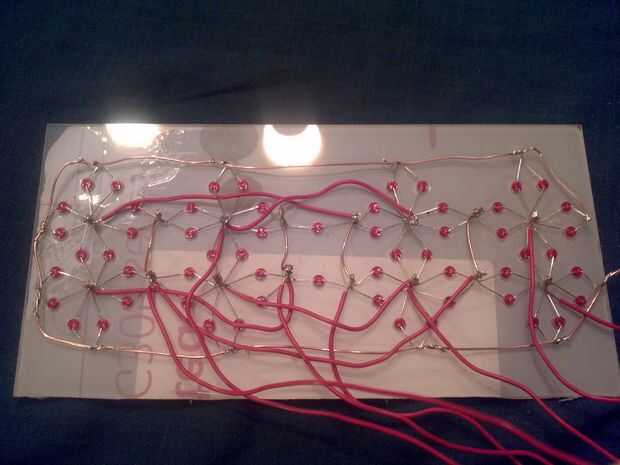 Comprobar la orientación de cada par de LEDs que insertarlos. Una vez que ha completado un dígito puede torcer juntos los cables en los centros de la 8. A pocos giros es bueno. No ser demasiado loco o podría romper algunos cables. Después de todo los LEDs están instalados, puede instalar las líneas de charlieplexed 8 numeradas 0-7. Nota que allí hay un par de puentes lo que también tendrá que instalarse para conectar a grupos del mismo número. Ver las fotos si no está seguro. Recomiendo altamente numeración de los cables con cinta adhesiva, por lo menos hasta que llegue todo juntos. Soldar las conexiones entre sí y luego recortar cualquier exceso de conductores.