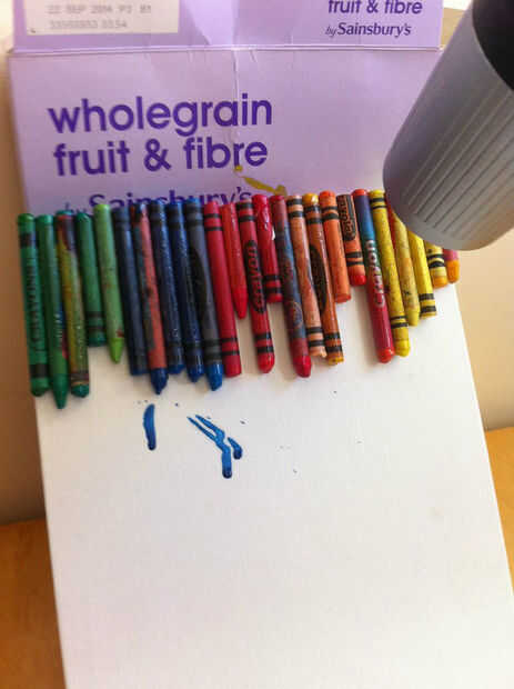 Aplique el calor de un secador directamente a los lápices de colores, recomiendo tenerlo en el ajuste más lento caliente tienes, si tienes exceso de aire que sopla hacia fuera la cera tiende a ir un poco loco y sopla en el lugar.